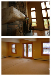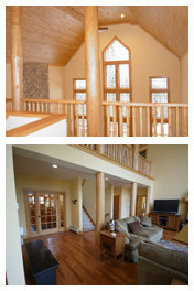 The Main Floor Plan begins with a rustic front entranceway incorporated into an air-locked ski/mud room which is also accessed by a side entrance. Both entrances are protected from the snow and rain by a large wraparound front porch. The ski/mud room is equipped with a washer/dryer closet and lockable owners' ski closet and its tile floor area is spacious for many to prepare to engage the outdoors. The two-story living room is grand in size with its wood burning fieldstone fireplace, towering windows and wide plank pine flooring. The large Kitchen/Dining room is well appointed with hardwood cabinets and granite countertops; its design incorporates the kitchen's functional space with the living and dining space. Even in the kitchen space, its occupants will not miss any of the family fun. Finally, the Master Bedroom, located on the first floor, has ample space for a sitting area and boasts a large walk-in closet and large master bath.